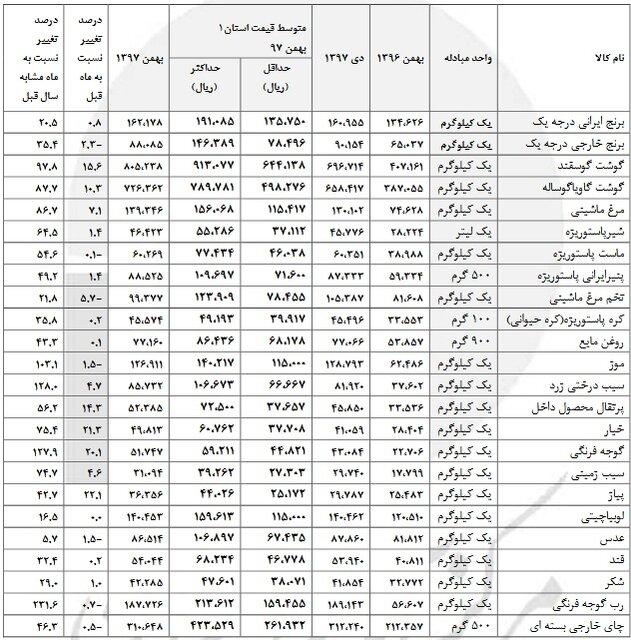 بنا بر این گزارش، متوسط قیمت گوشت گوسفند در بهمن ماه حدود ۸۰ هزار تومان، گوشت گوساله و گاو ۷۲ هزار تومان، مرغ حدود ۱۳ هزار تومان، موز ۱۲ هزار و ۶۰۰ تومان و رب گوجه فرنگی ۱۸ هزار و ۶۰۰ تومان بوده است.