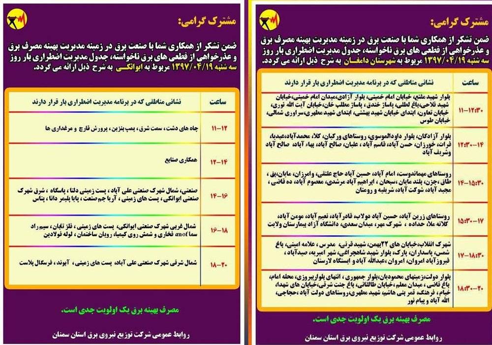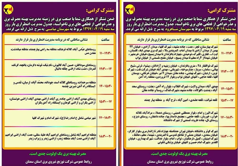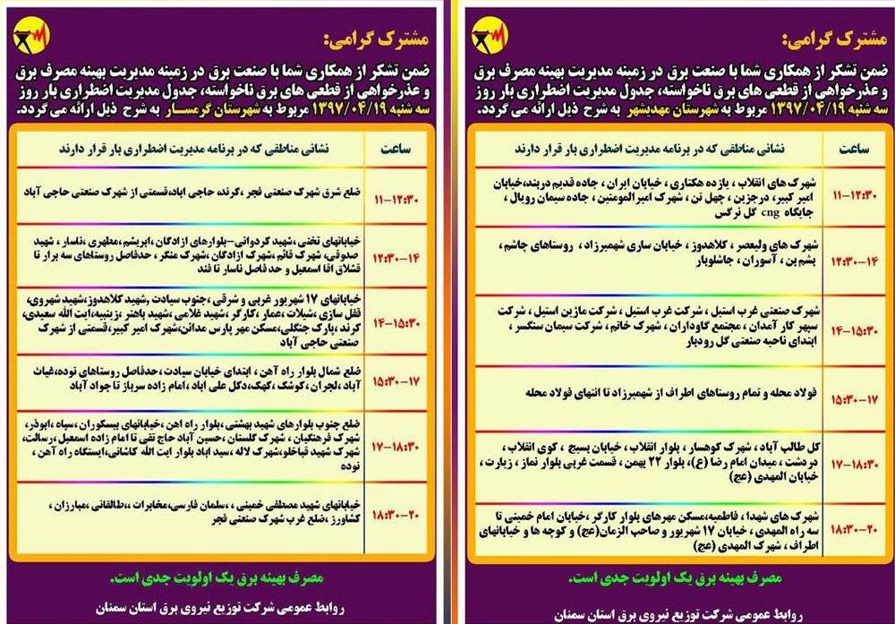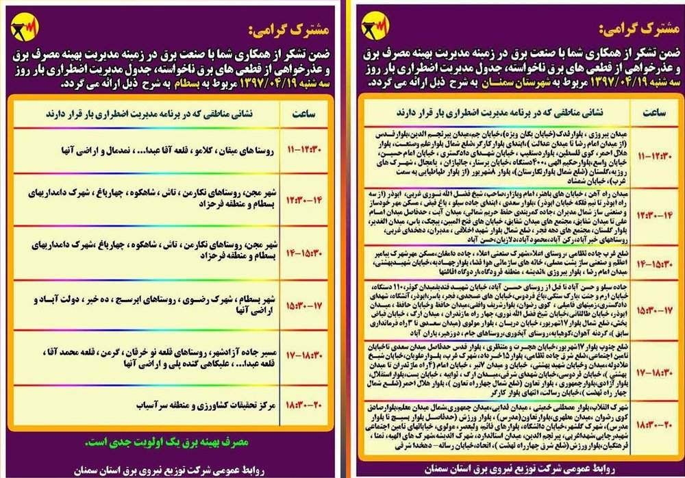 زمان بندی قطعی برق در سمنان؛ به گزارش سرپوش به نقل از روابط عمومی شرکت برق استان سمنان، جدول خاموشی برق در روز سه شنبه برای شهرستان های شاهرود و سمنان، دامغان، مهدیشهر و ... به این شرح است: