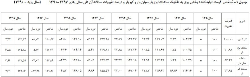 شاخص قیمت تولیدکننده بخش برق، بر مبنای سال پایه ١٣٩٠، در ساعات میان بار، در سال ١٣٩٧ برابر ۱۲۲.۵۹ است که نسبت به سال قبل ٣.٩٨ درصد افزایش داشته است.