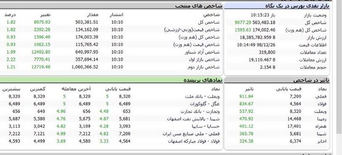 تاکنون نماد ملی صنایع مس ایران (فملی)، فولاد مبارکه اصفهان (فولاد)، بانک ملت (وبملت)، گروه مپنا (رمپنا)، شرکت ارتباطات سیار ایران (همراه)، پالایش نفت اصفهان (شپنا) و مخابرات ایران (اخابر) بیشترین تاثیر مثبت را بر شاخص کل داشتند.