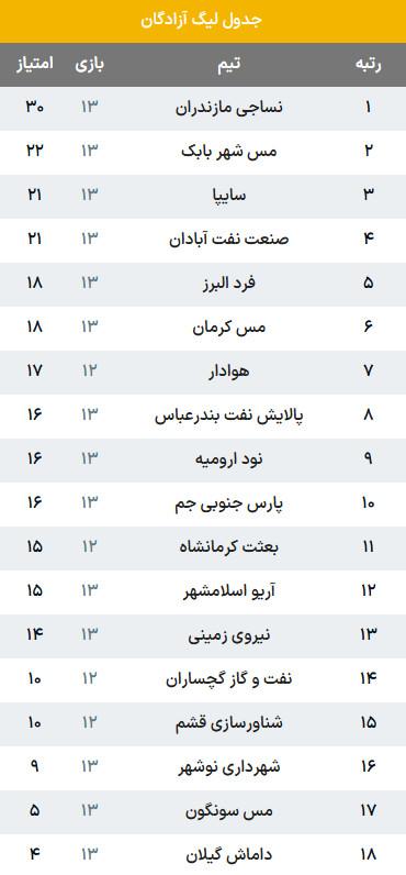 نتایج بازیهای روز گذشته از هفته سیزدهم لیگ دسته اول فوتبال در زیر آمده است: