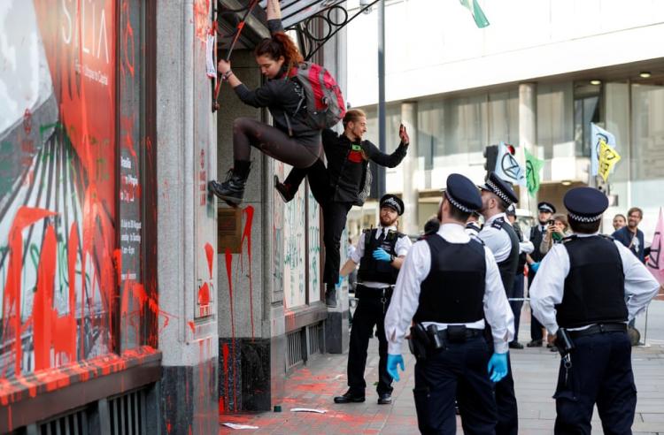 فعالان محیط زیستی معترض به تغییرات اقلیمی در حال اعتراض در مقابل سفارت برزیل در شهر لندن/ رویترز