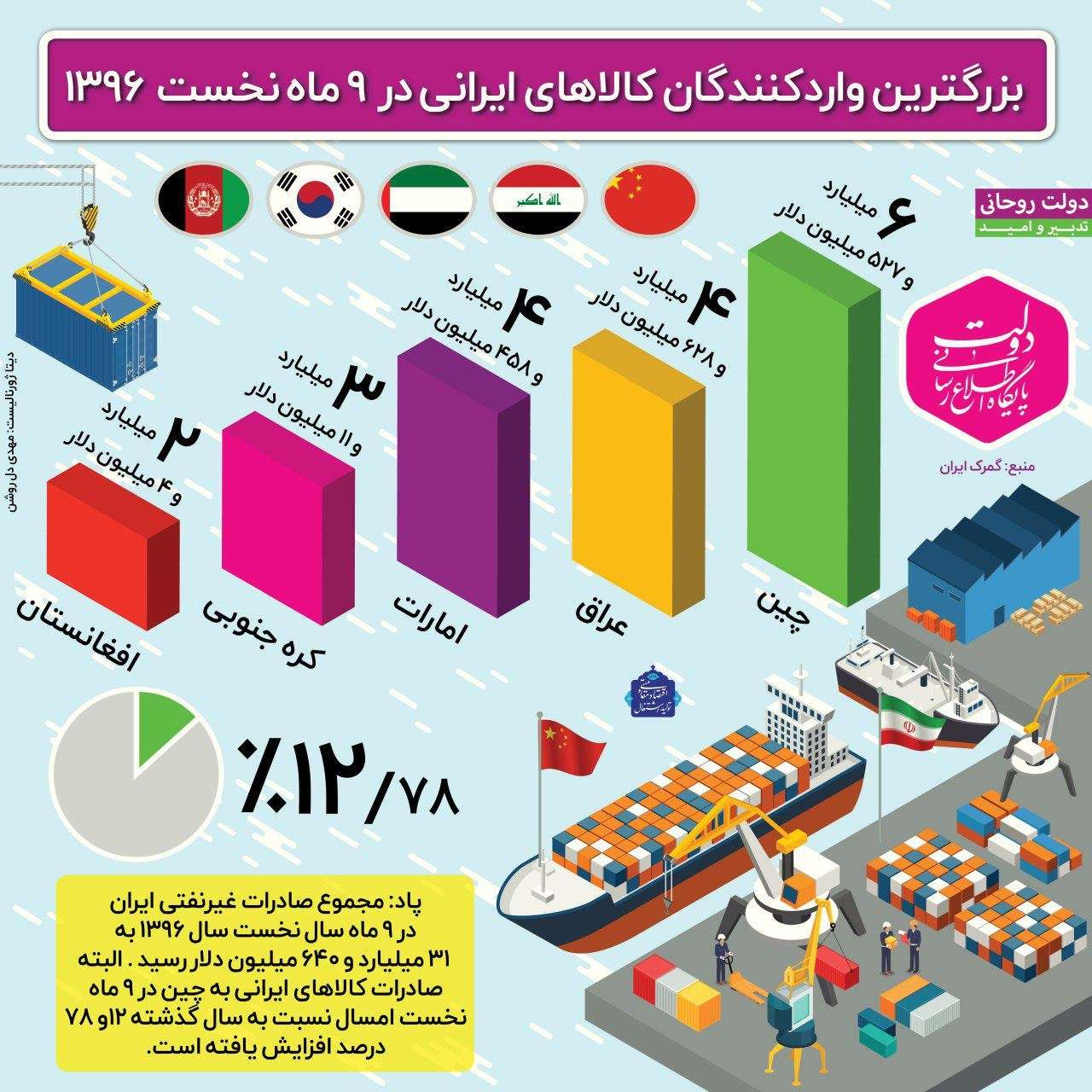 مجموع صادرات غیرنفتی ایران در ۹ ماه نخست سال ۱۳۹۶ به ۳۱ میلیارد و ۶۴۰ میلیون دلار رسید. البته صادرات کالاهای ایرانی به چین در ۹ ماه نخست امسال نسبت به سال گذشته ۱۲ و ۷۸ درصد افزایش یافته است.