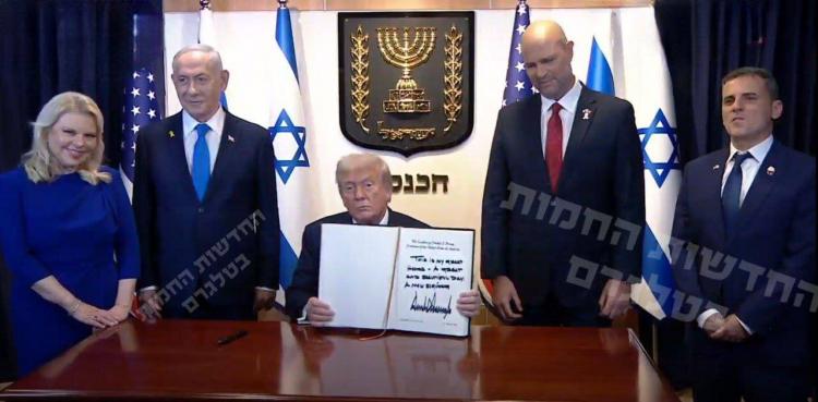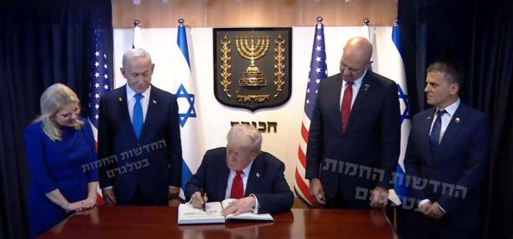 رئیس جمهور آمریکا در دفتر نخست وزیر اسرائیل دفتر یادبود این رژیم را امضاء کرد و نوشت: افتخار بزرگی برای من، روز زیبا، آغازی نو.